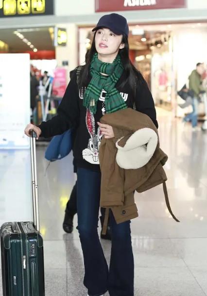 她选了一件黑色卫衣,简单大方,上面印了点字母和个小兔子图案,看着就特有活力。下边呢,她搭了条喇叭裤,这裤子修饰腿型那是一绝,显得腿又长又直。再踩上一双小白鞋,嘿,轻松出门没问题。